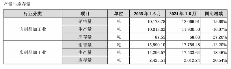 另外,记者注意到,今年上半年,煌上煌肉制品加工业和米制品加工业的销售量、生产量均同比下滑,库存量同比升高,足见其动销承压。