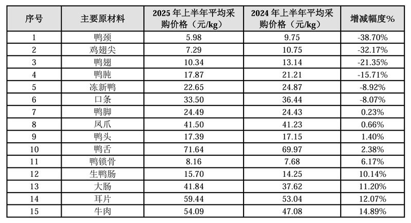 今年上半年,煌上煌酱卤肉制品业排名前15位的主要原材料采购价格变动情况。