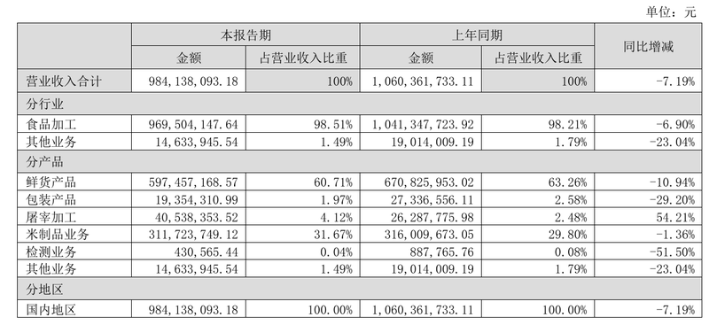 具体来看,今年上半年,除了屠宰加工,煌上煌的鲜货产品、包装产品、米制品业务、检测业务和其他业务的营收全面下滑。尤其是营收占比超六成的鲜货产品,营收同比下滑10.94%。
